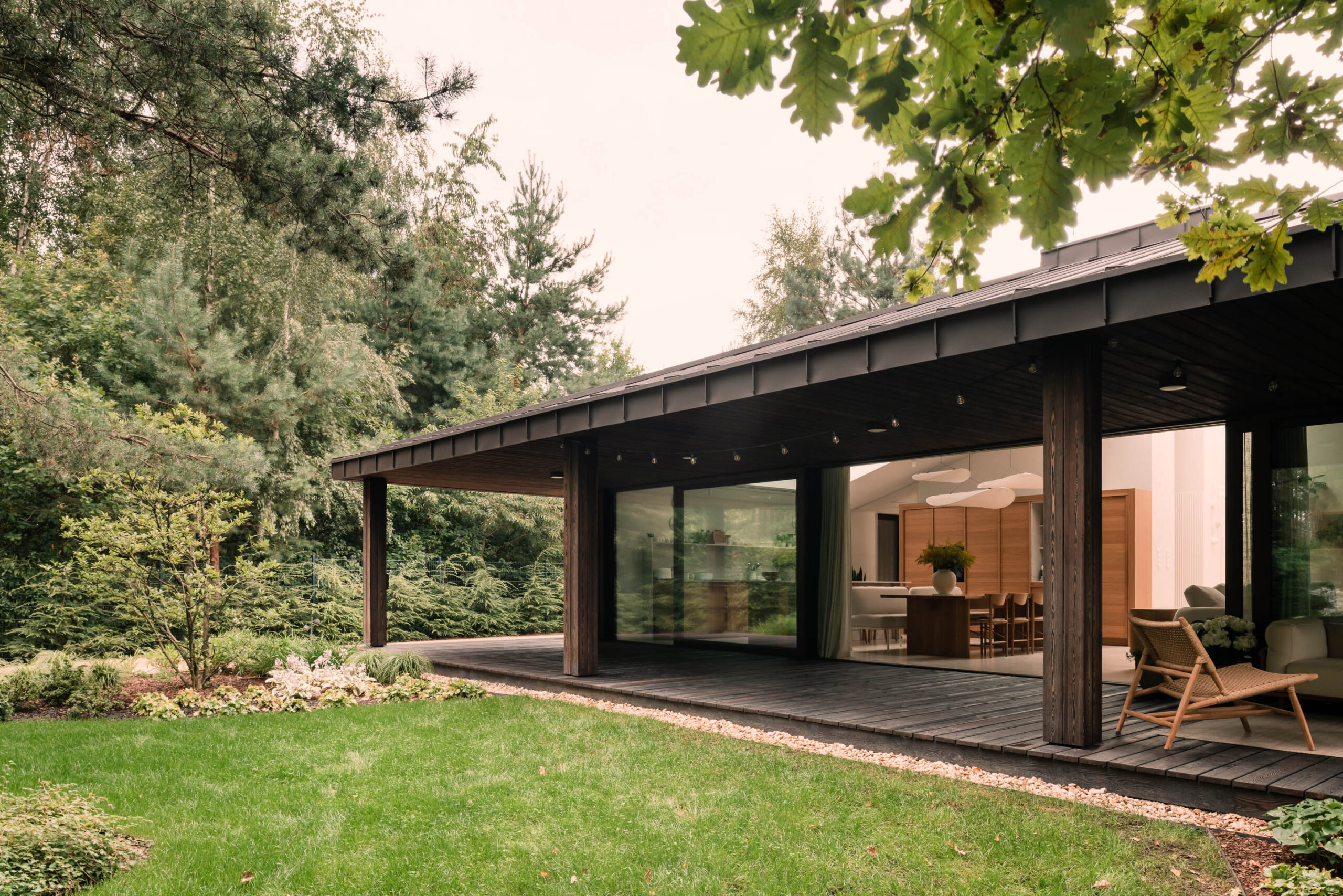 Dom znajduje się na gęsto porośniętej drzewami działce. Został jednak wpasowany pomiędzy istniejące drzewa, eliminując wycinkę lecz zyskując pożądany metraż. Zastosowane na elewacji materiały mają za zadanie harmonizować z otoczeniem, równie miękko jak zastany drzewostan, reagować na grę światła i cienia. Wybór padł więc na drewniane deski elewacyjne, opalanych do ciemnego brązu (MAZURIA-2). Ciemną elewację skontrastowano z wnętrzem domu, utrzymanym w jasnej tonacji i minimalistycznej stylistyce.